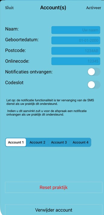 Tik rechtsboven op Activeer en vervolgens op Sluiten. Lukt het activeren niet dan dient u de praktijk te resetten en opnieuw Orthodontie Oud-Beijerland te kiezen.